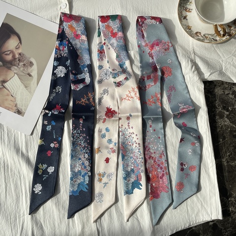 100x5cm Mulheres Americanas Europeias Imitação Impressa De Seda Estreito Cachecol Sarja Tie Bag Handle Small Ribbon Bag Cabelo
