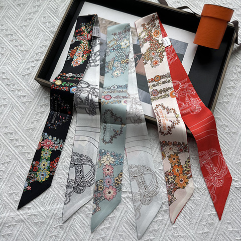 Lindo Vintage Rédeas Bridle Floral Impresso 100% Skinny 86*5cm Lenço De Seda para As Mulheres Proteção De Verão Fita Do Lenço Pequeno